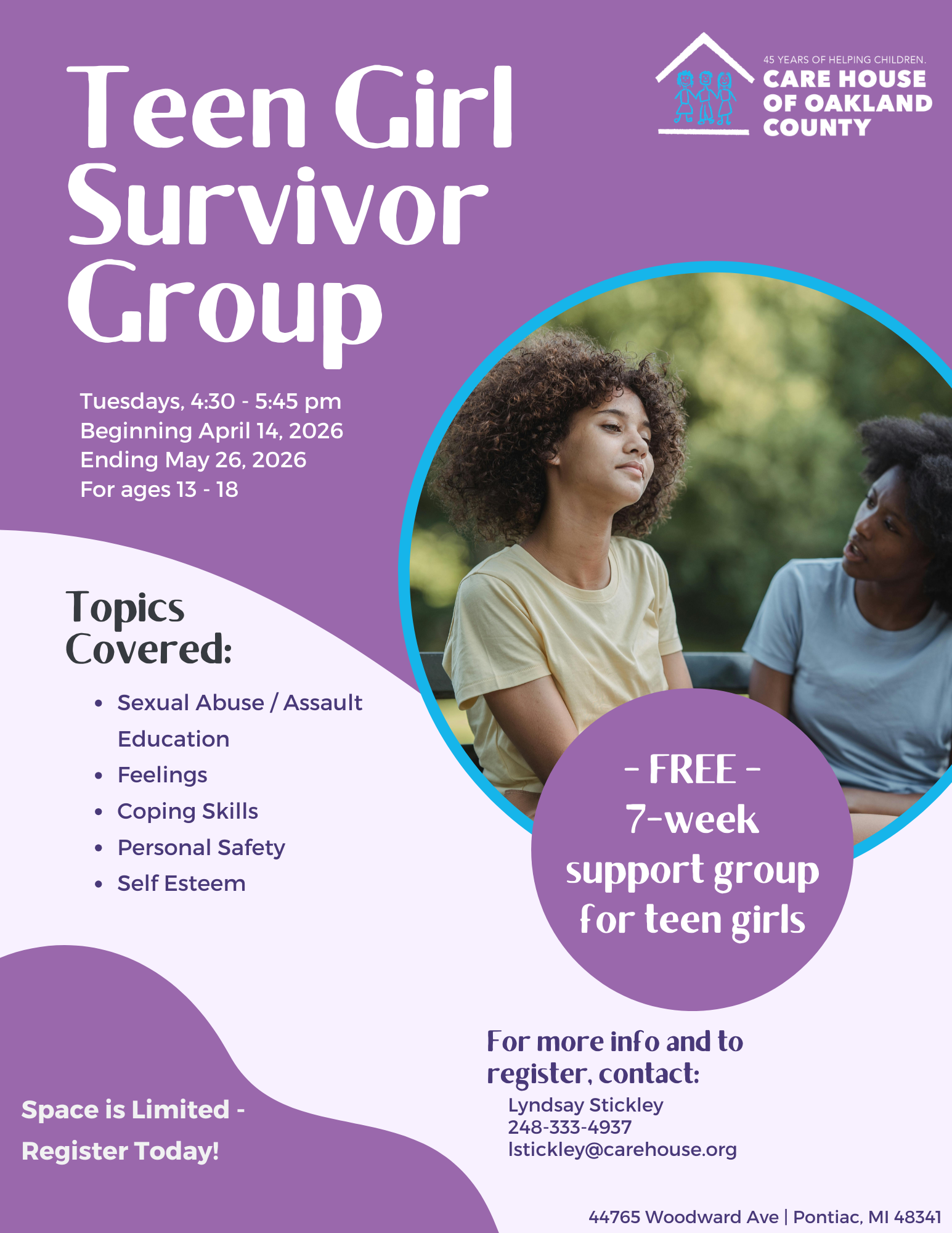 That is why CARE House of Oakland County offers the Teen Girl Survivor Group, a seven-week program designed specifically to help 13 to 18 year-old girls, at no cost to them or their families.